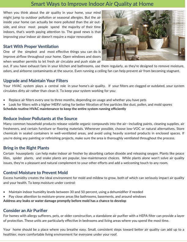 This month's newsletter also shares several simple ways homeowners can improve indoor air quality, including: