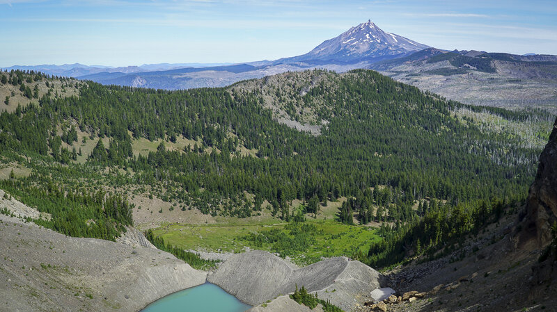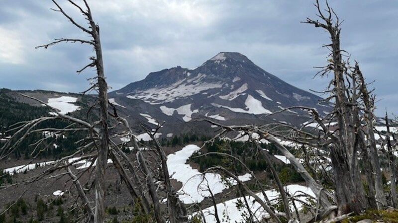 Although many will hike to Green Lakes and enjoy the experience of the lakes in the valley between South Sister and Broken Top, relatively few hike to Camp Lake and see South Sister so close from the north. The hike to Camp Lake (Pole Creek trailhead just outside of Sisters) takes you through several miles of burned forest before hikers enter living forest, so it can be hot and dusty in the summer. However, once hikers reach unburned trees, the hike becomes more pleasant. In recent years, the fallen trees of the burned forest have been cleared from the path, so scrambling over, under and around fallen logs was not an issue in 2024.