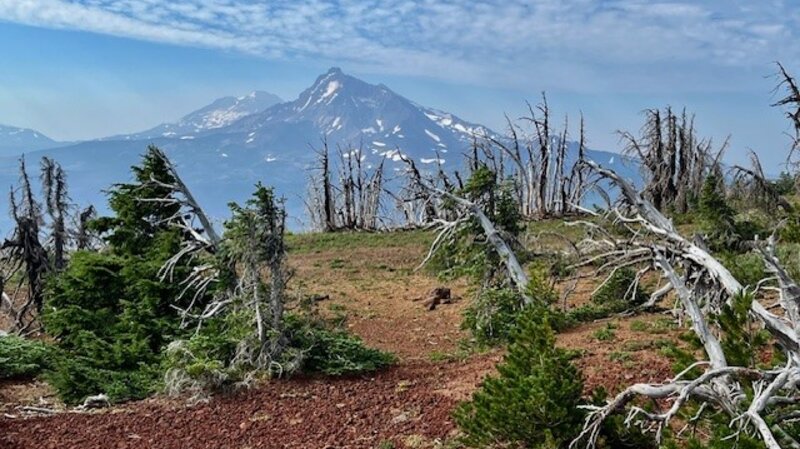 On August 3, 2024, the air in Central Oregon was better than it had been earlier in the week (many Oregon forest fires have impacted air quality), so the hike to Camp Lake was relatively clear. Views of North and Middle Sister stood out among the dead forest, but it was also interesting to see the new growth in acres of manzanita, grasses, some wildflowers, and young trees.