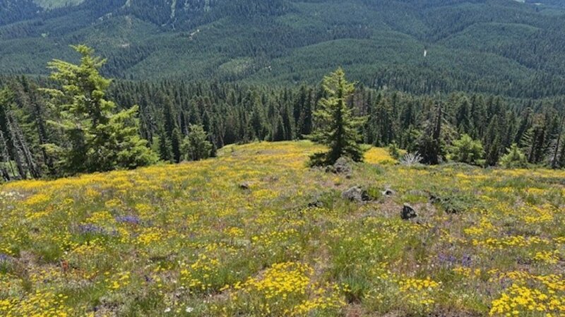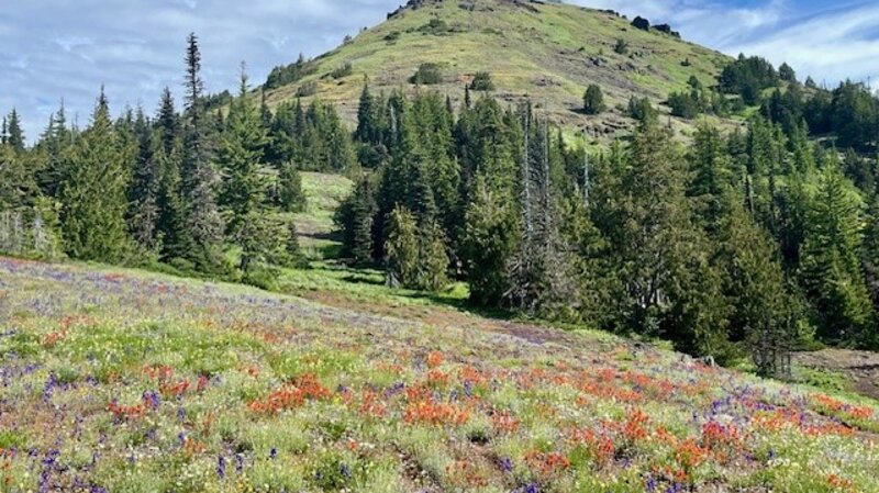 Iron Mountain and the Cone Peak Trail are probably one of the best hikes for wildflowers in Central Oregon. Each year many Oregonians will hike to the top of Iron Mountain, or take the full Cone Peak loop to enjoy the flowers.  Experts state that most of Oregon's 300 + wildflower species can be located near Iron Mountain as well as over 17 species of trees. For those starting at the Tombstone parking lot, the entire hike exceeds 1900 feet of elevation gain in seven miles. The time of the hike will probably depend on how often hikers stop to check out the flowers and views, but most can complete the full loop, including the side hike up and back to the top of Iron Mountain, within 4 hours. The mountain was especially beautiful the end of June, 2024.
